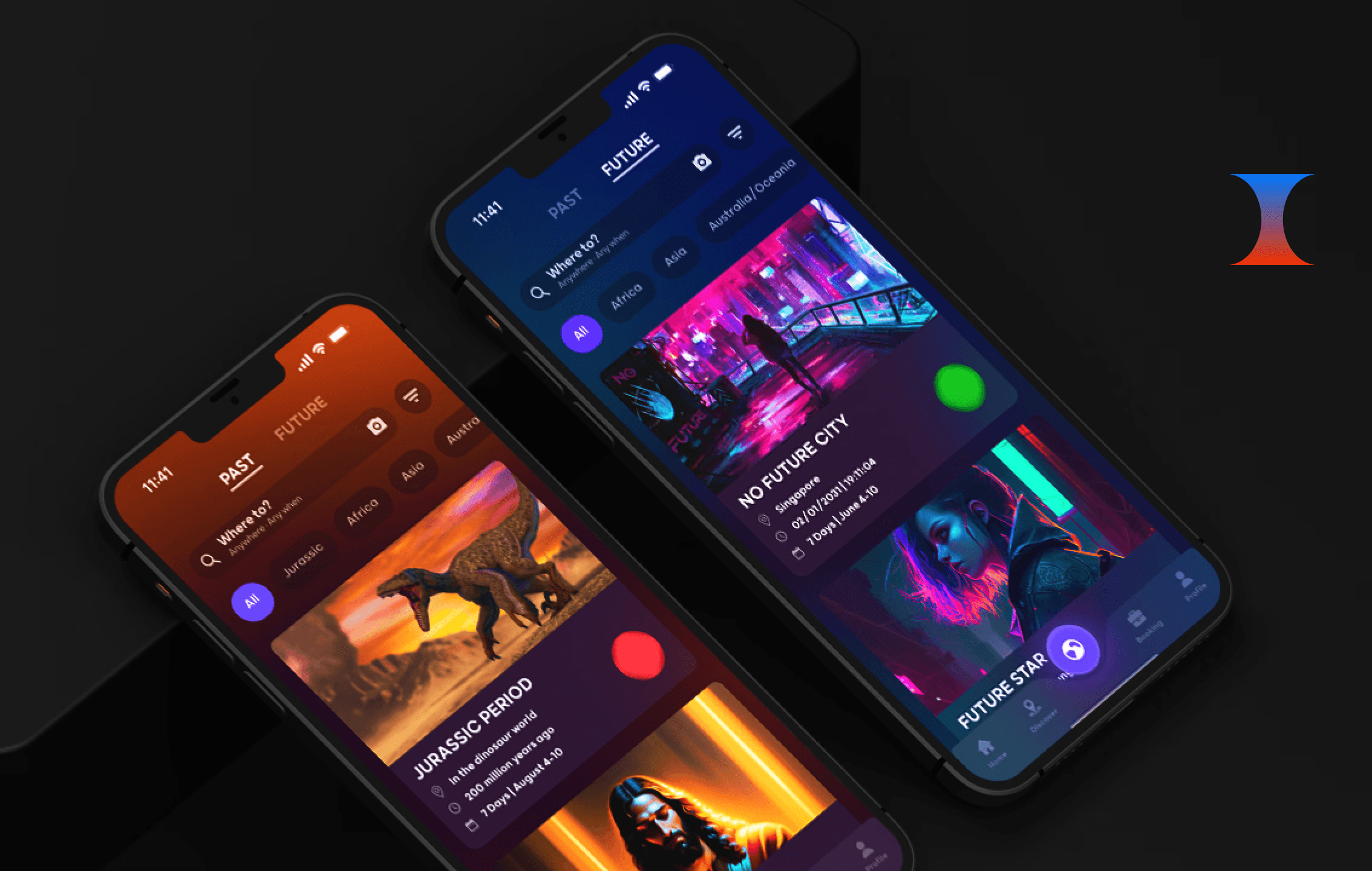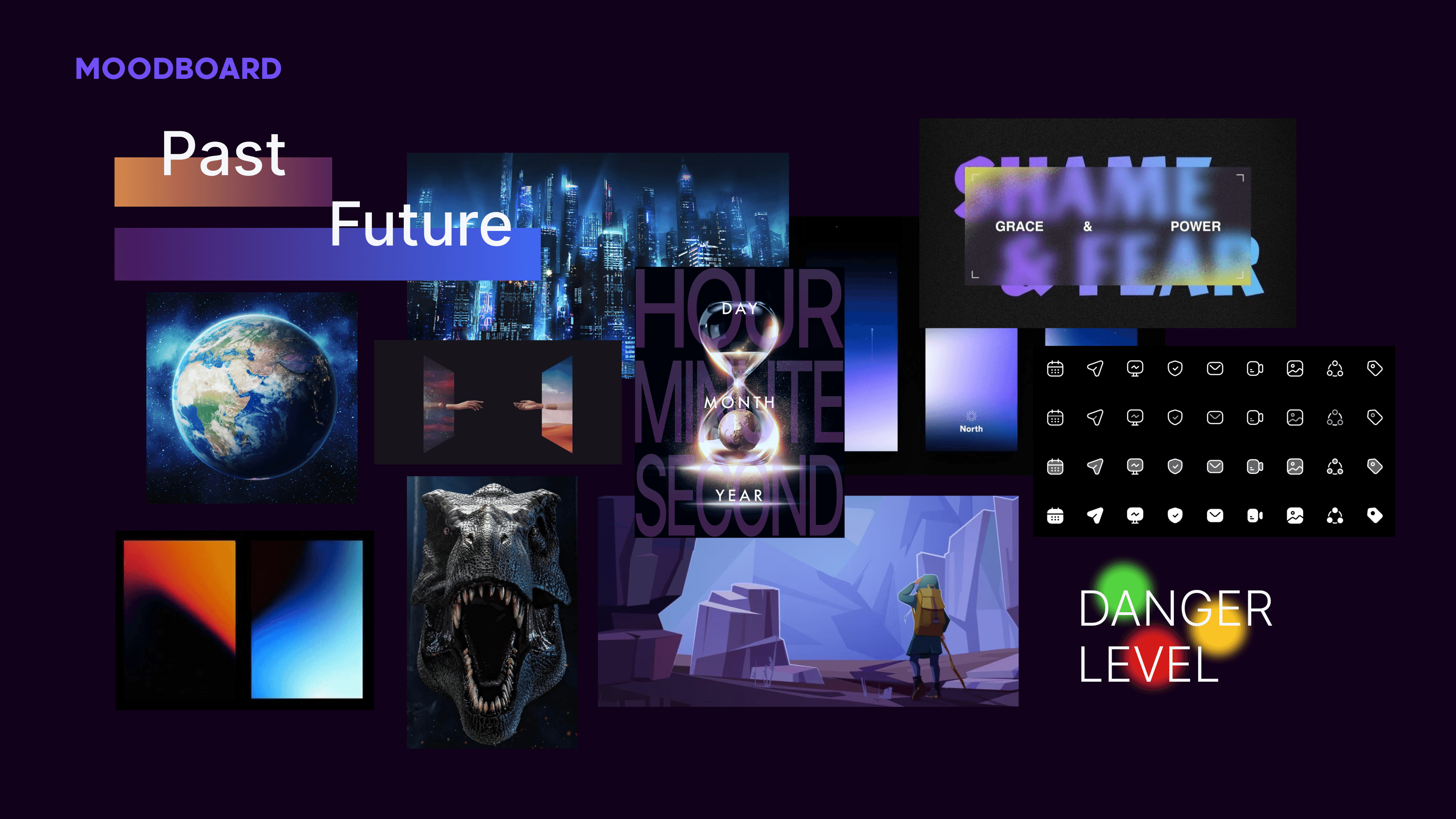 The design was guided by three main keywords: Vibrant, Glass, and Borderless. These reflect the energy, clarity, and freedom of time travel. The moodboard uses a wide range of colors to support this idea. Orange represents the past with a warm and nostalgic feeling. Blue stands for the future, giving a sense of technology. Purple, used for the present, combines both feelings and gives a magical vibe, as if the user can go anywhere in time.