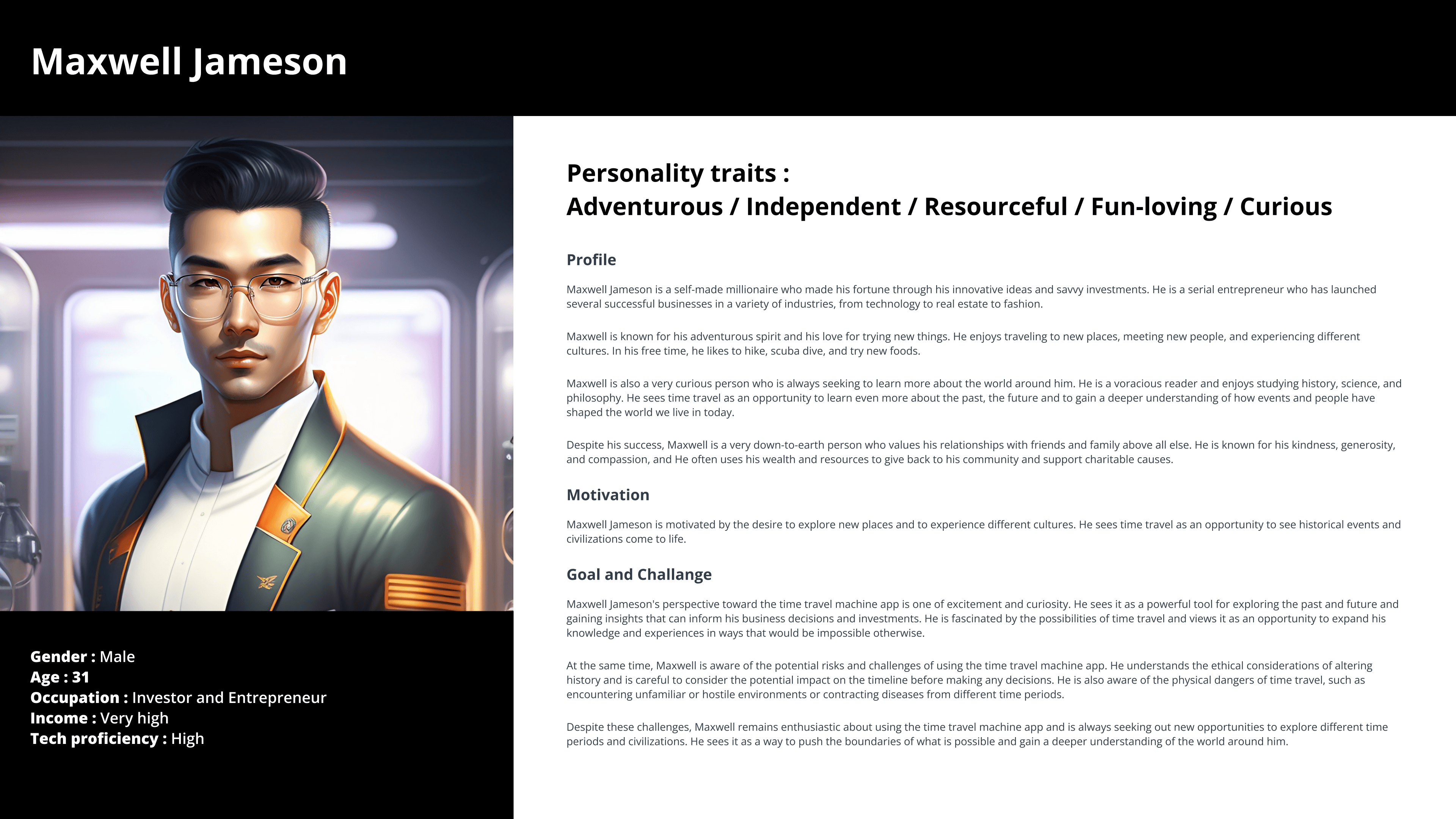 My main user is Maxwell Jameson, a tech-savvy investor and entrepreneur. He loves to explore new places, learn about history, and try new things. Time travel is exciting to him because it helps him learn and grow. This persona helped me understand that users want the app to be easy to use, safe, and full of useful information. It also guided our design to match the needs of curious and independent users.