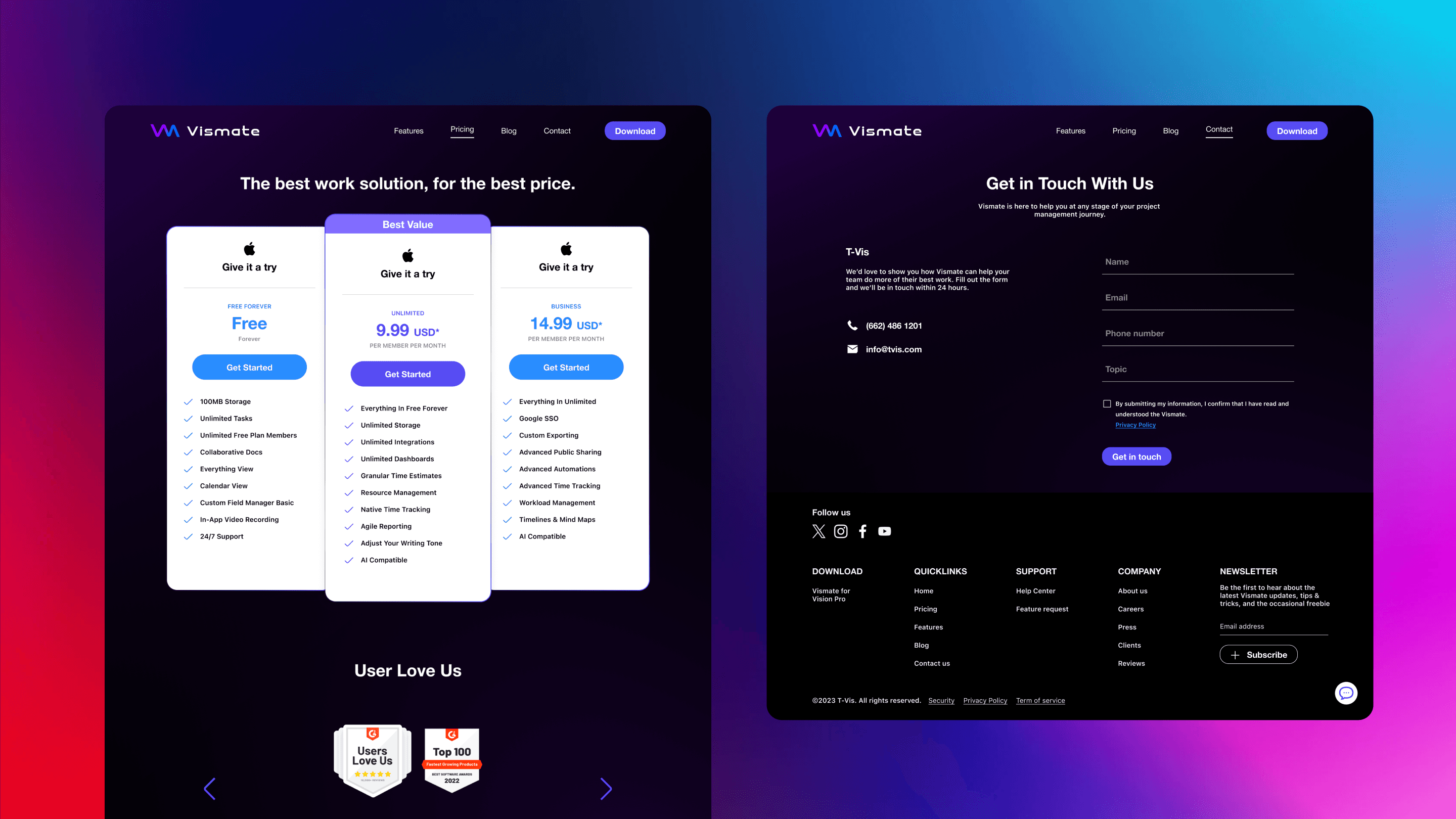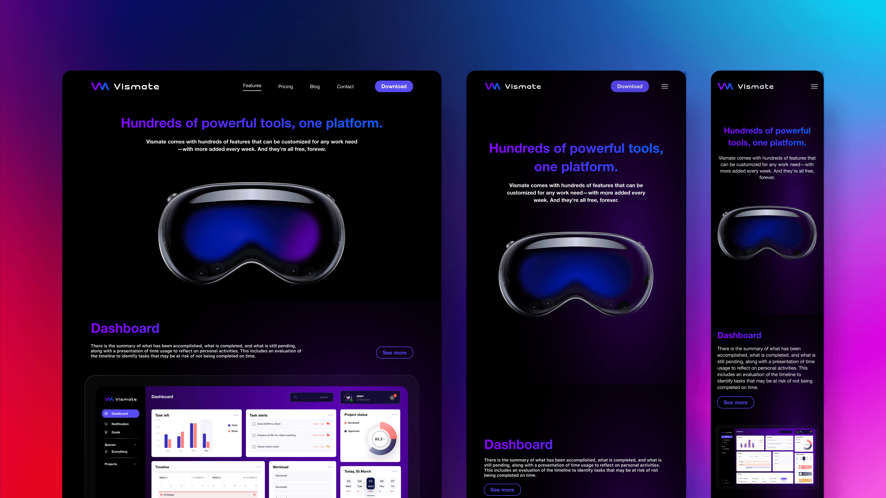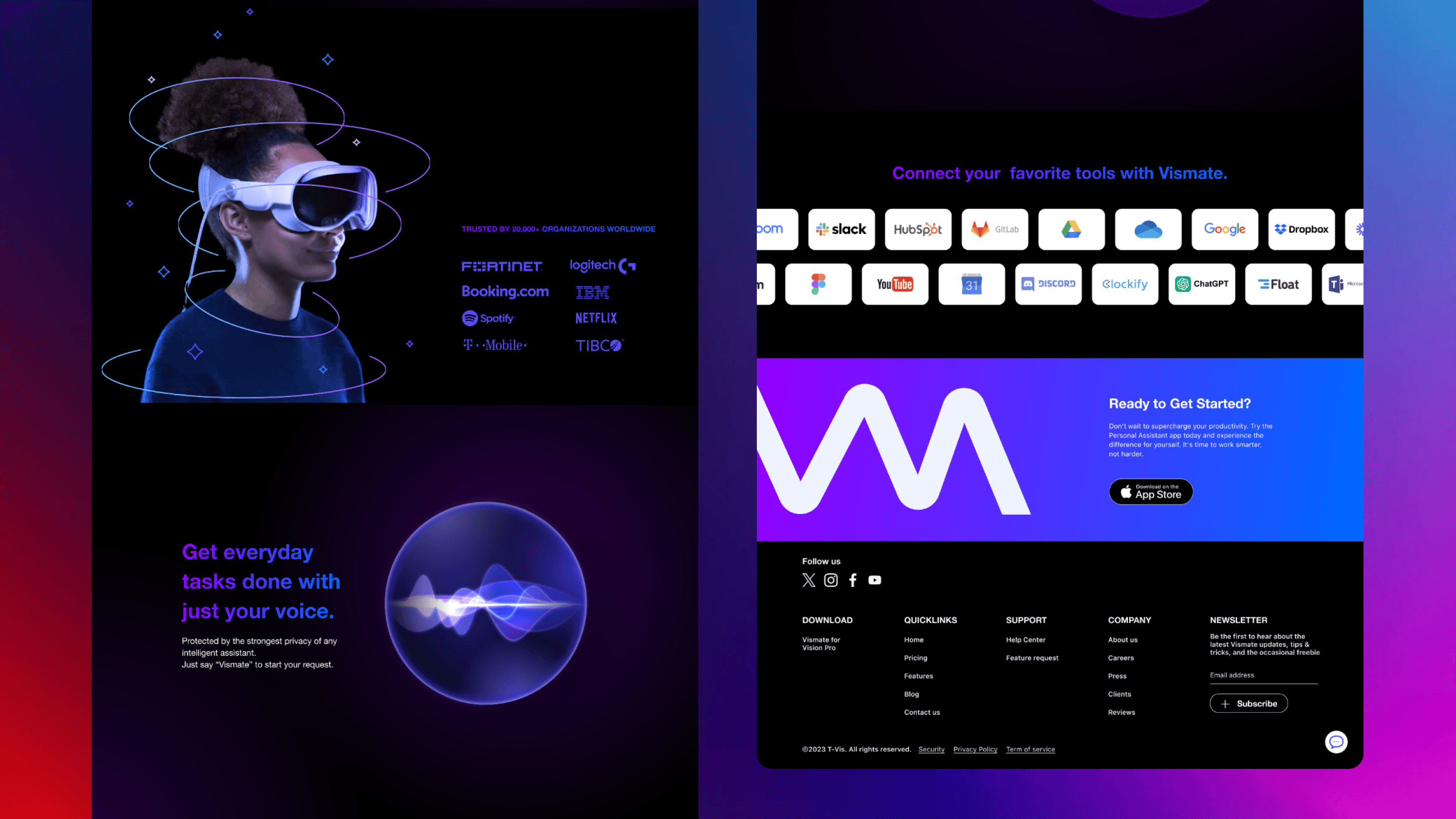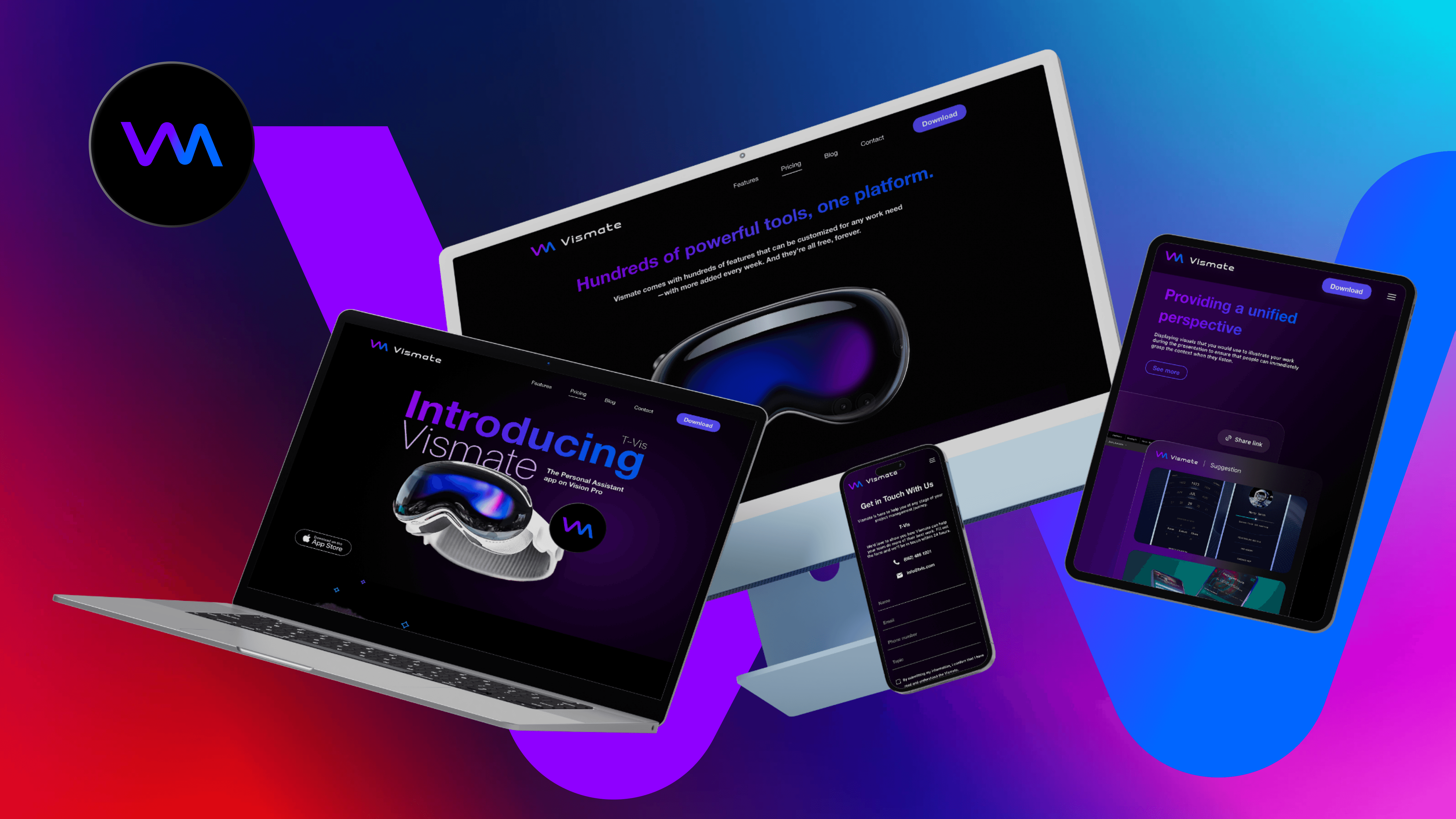 The visual direction of this website was guided by the keywords Gradient, Glass, and Futuristic. These ideas were chosen to reflect the innovative and modern feel of the Vismate app, which is built for Vision Pro.