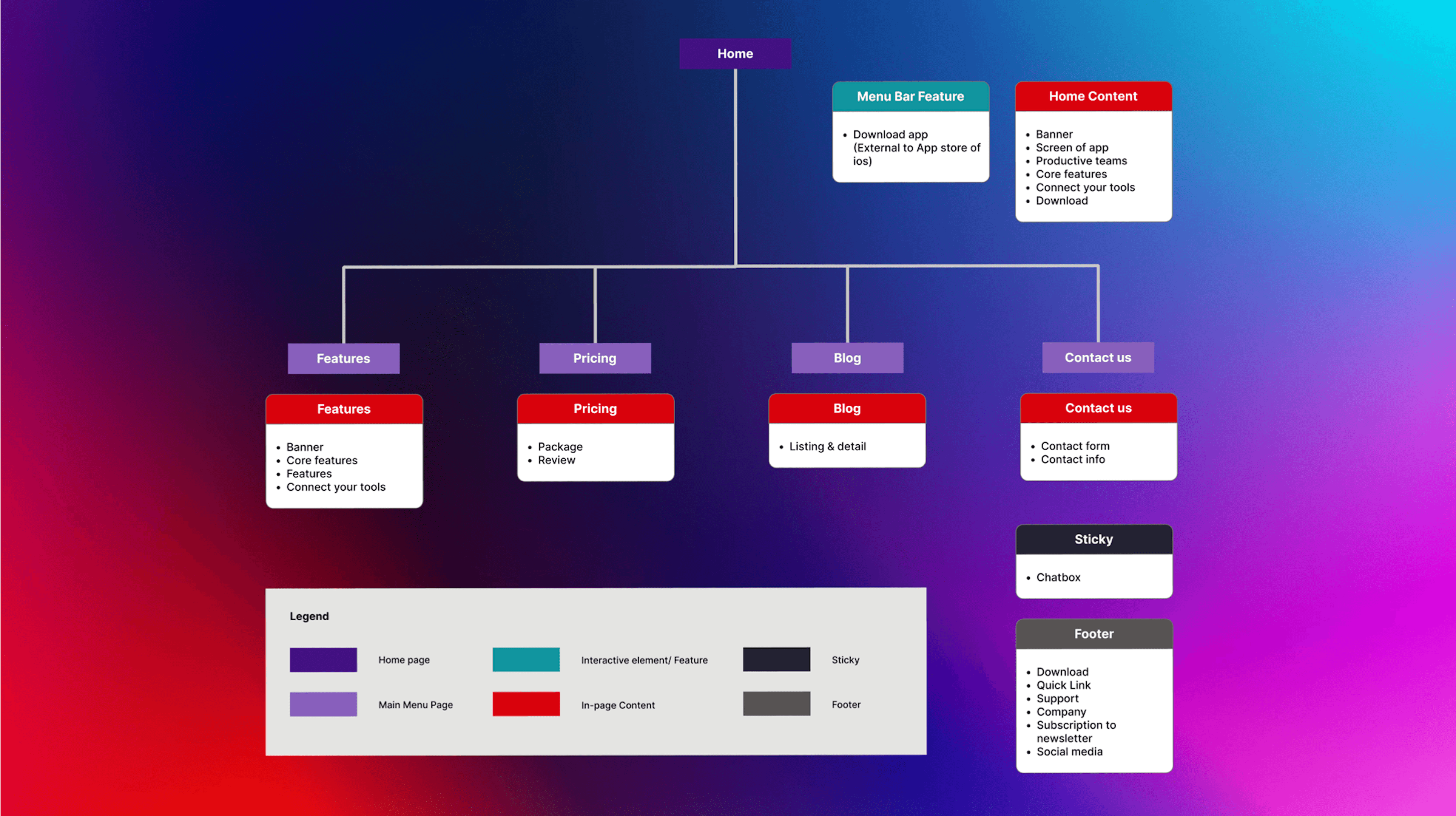 The website structure was planned to make it easy for users to understand what Vismate does and how it helps with productivity. It includes key pages like Homepage, Features, Pricing, Blog, and Contact, along with extra elements like a sticky chatbox and footer. Each part is designed to follow the user journey from discovering the app to understanding its features and deciding to use it.